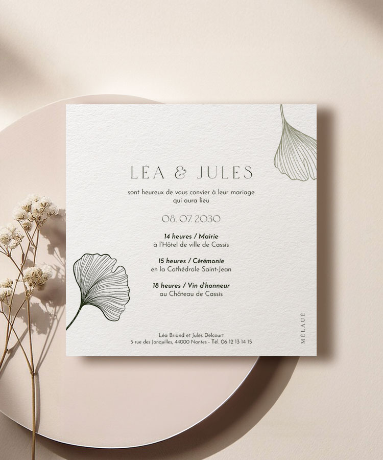 Plongez dans l’univers délicat et poétique du modèle <b>Feuilles de Ginkgo</b>, un faire-part de mariage empreint de <b>douceur et de modernité</b>. Ce modèle unique au format carré célèbre l’union avec un design naturel et raffiné, pensé comme une invitation à partager une journée inoubliable.